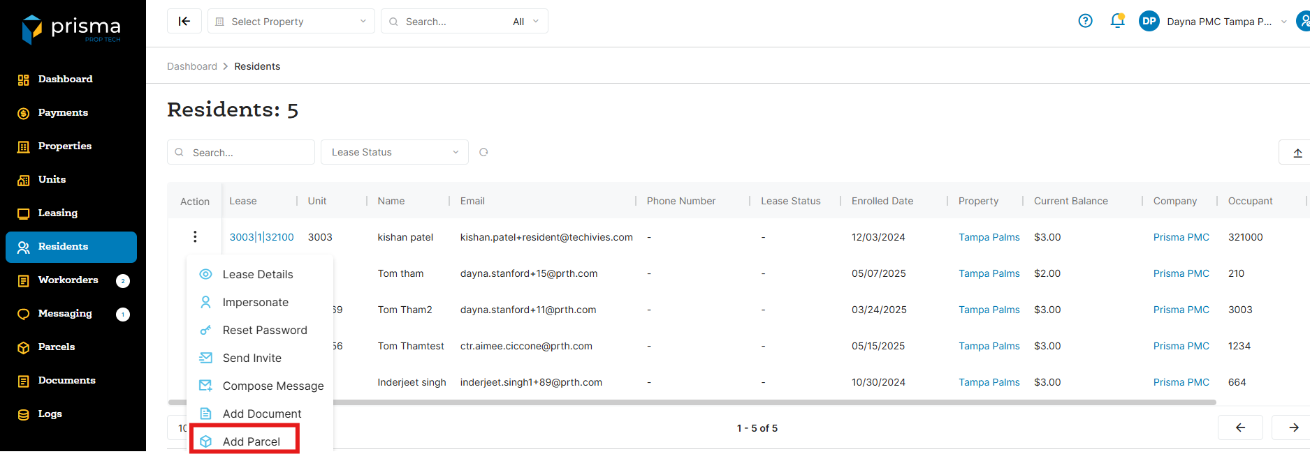 - Once you locate the resident you want to edit, click the three dots in the ‘Action’ column and select ‘Add Parcel’
