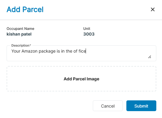 - Once you click ‘Submit’, the resident will receive the message in their Prisma Resident Portal under the ‘Parcel’ section