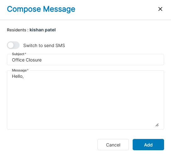 - Enter the subject and message you want to send. Once done, click ‘Add’