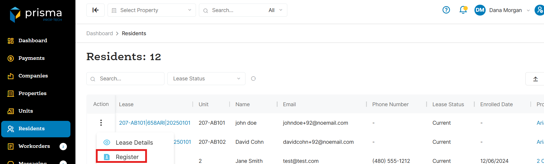 - Once you locate the resident you want to register, click the three dots in the ‘Action’ column and select ‘Register’