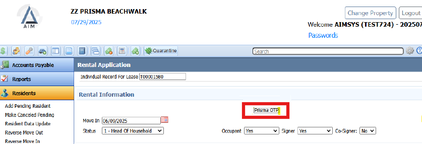 - Under the “Rental Information” card, click the “Prisma OTP” button.