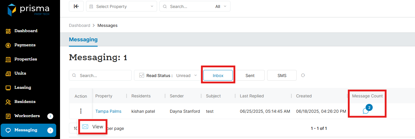- By default, you will land in the ‘Inbox’. Once you locate the message you want to view, click the three dots in the ‘Action’ column and select ‘View’