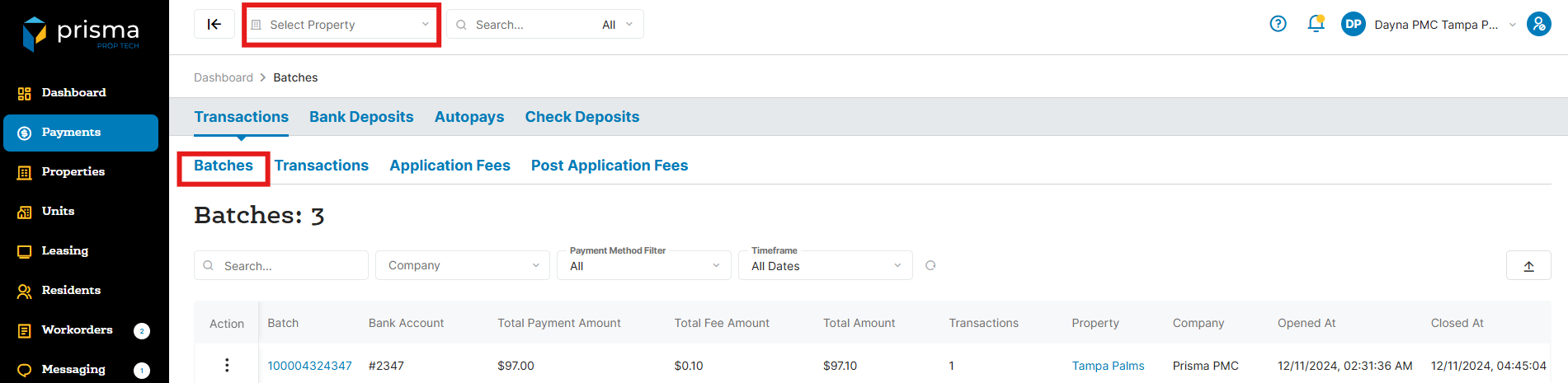 3. If required, you may filter by property at the top of the screen by selecting the property from the drop down