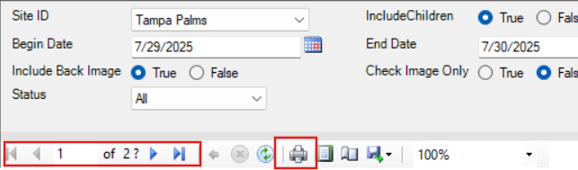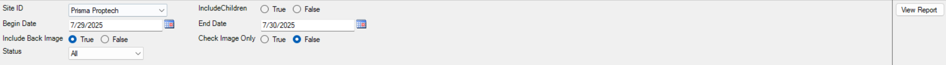 - Depending which report you select, different filter options will display. Using the Check Detail as an example, you will choose your site ID, if not defaulted, the date range, if you want the check image included and which stauts. Once all items are selected, click view report on the far right